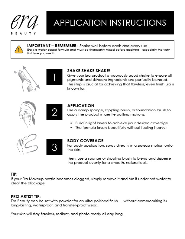 Era Face Airbrush Spray on Foundation is the original patented formula and delivery system that brought spray on cosmetics to the market. It's found on movie sets and runways the world over because of it's long lasting buildable coverage. Get the flawless airbrushed look for your daily routine.